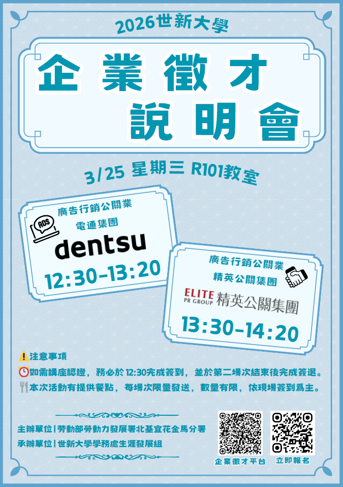 2026企業徵才說明會《廣告行銷公關業》,3/25(三)歡迎報名參加!