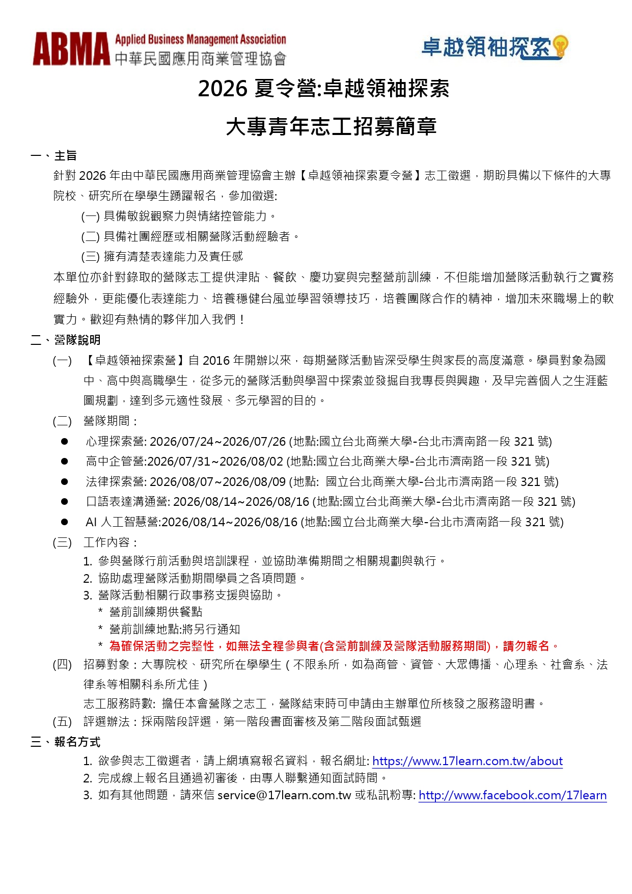 【2026夏令營:卓越領袖探索-大專青年志工招募簡章】